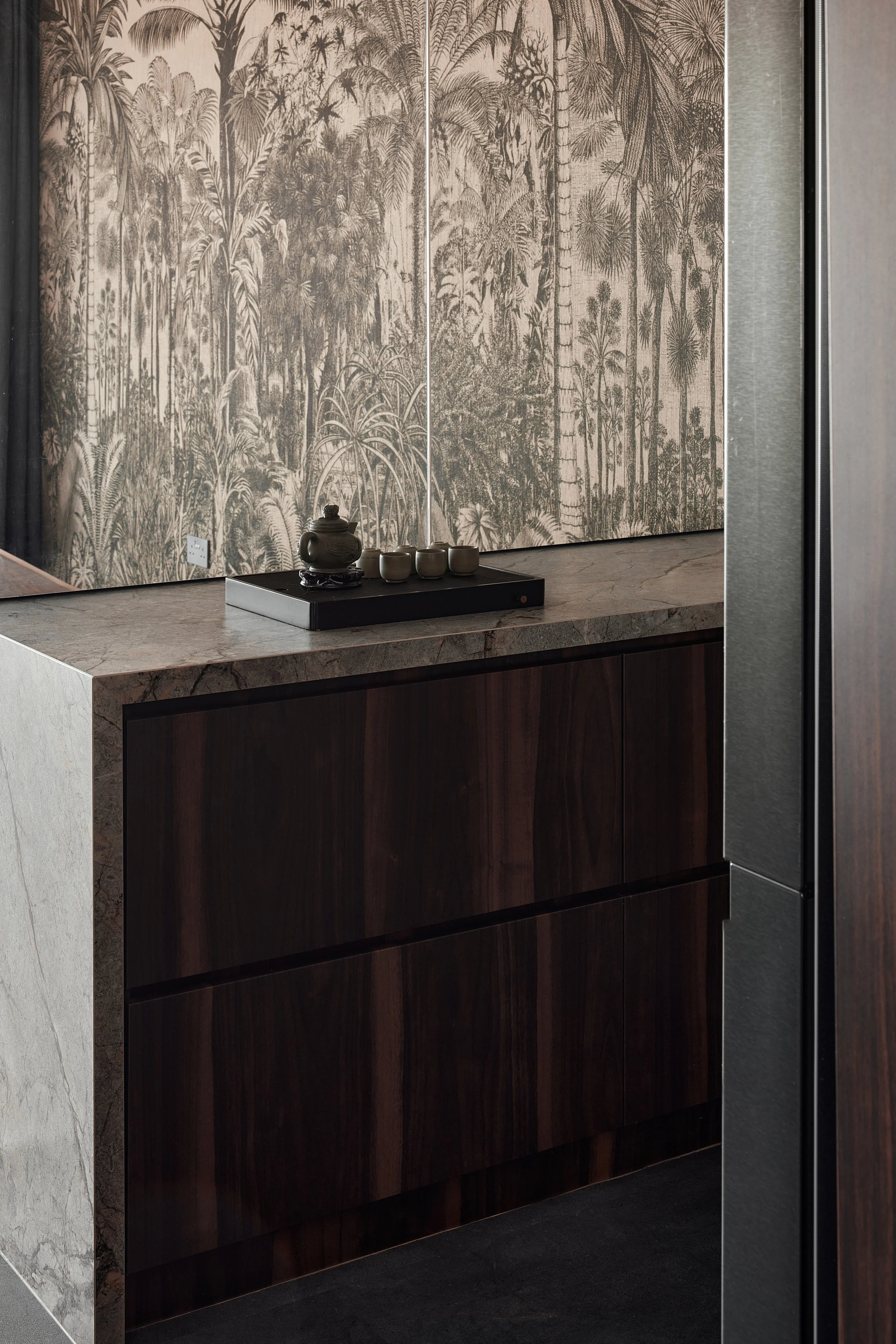 In the private quarters, contemporary sensibility takes on a tactile richness. Hand-applied Belgian wallpapers are paired with bamboo detailing and organic motifs, infusing the bedrooms with a subtle rhythm. These layers of natural materials and nuanced patterns lend the space both visual and emotional texture, elevating it from the everyday without straying from comfort.